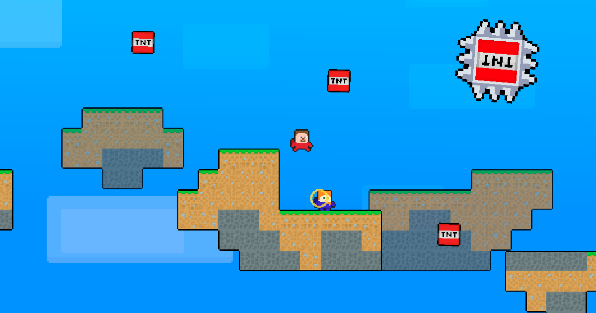 Two astronauts must endure in the realm of skyblock, one being Steve and the other Alex. Assist these two companions and guide them to the portal, or they risk defeat. The landscape is fraught with perilous TNT boulders and swirling sharp TNTs that can eliminate you should you venture beyond the safety zone; exercise extreme caution. Gather 3 gold ingots alongside your partner, and one of you will access the portal.